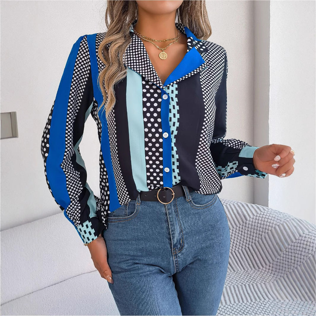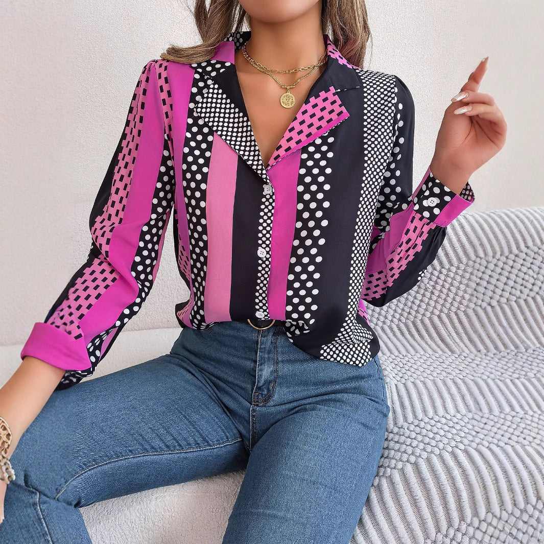 Chemise à manches longues à col de costume à pois de couleur contrastée