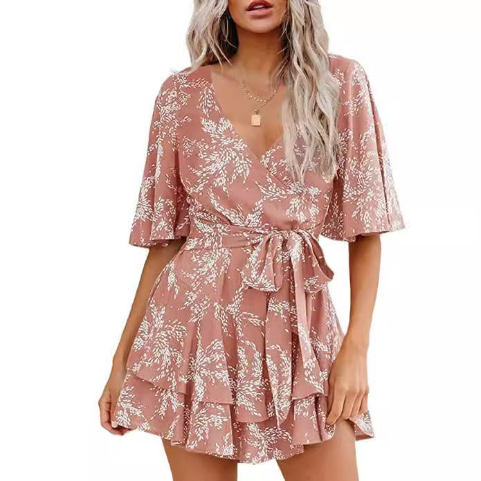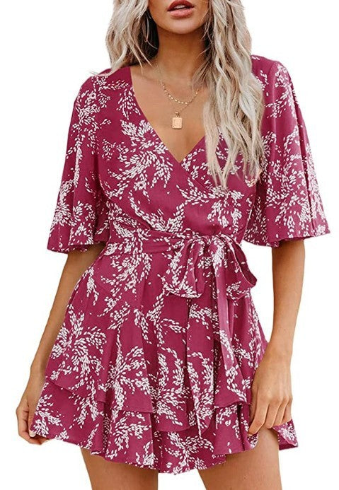 Robe plissée florale à col en V, manches évasées et ceinture à la taille